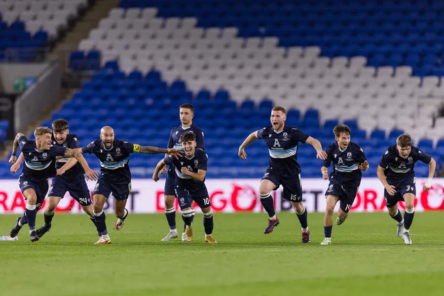 1,716 fans watched a dramatic late Lee Jenkins equaliser in normal time then an even more eventful penalty shootout. Zac Jones was the penalty hero yet again! The Bluebirds from South West Wales put themselves on the map by defying the odds and beating the Ballistet 3-2 on penalties.